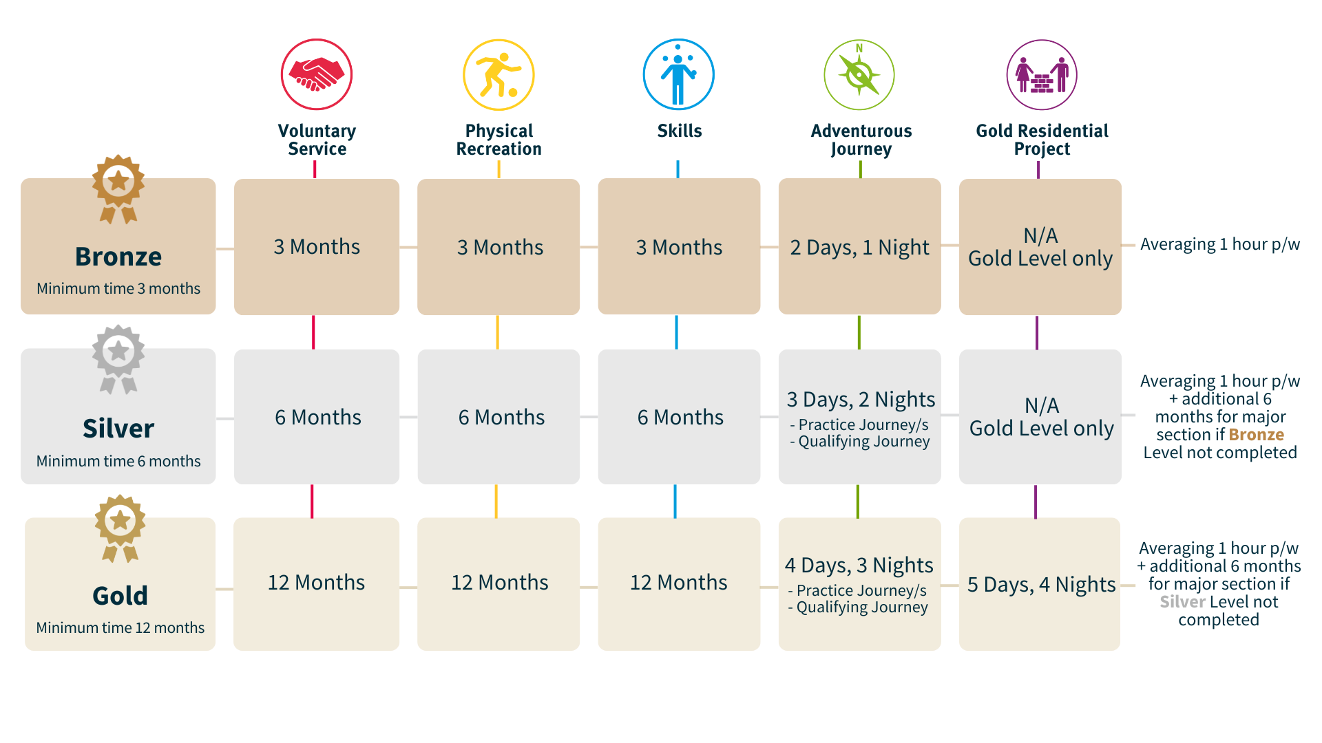 Note: an extra six months of effort must be undertaken in either Service, Skills or Physical Recreation at Gold Award level if the participant has NOT completed their Silver Award. |
